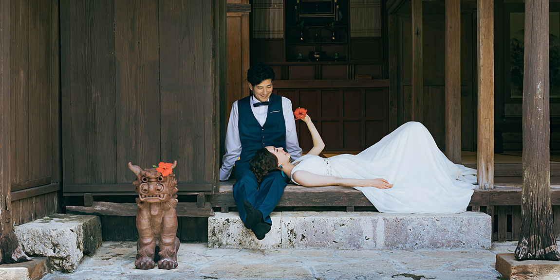 国の重要文化財に指定されている、沖縄戦前の形が残る貴重な古民家での撮影 屋根や軒が沖縄らしく、ビーチとはまた違う良さがあります